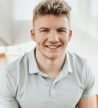 A person is seated at a music production setup, featuring a computer screen displaying music editing software. The setup includes speakers on either side of the desk and various music production equipment.